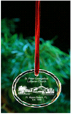 Our St. Peter Women of the ELCA (WELCA) have an offer you CAN’T refuse! While supplies last, you may purchase a commemorative crystal ornament, etched with a rendering of St. Peter Evangelical Lutheran Church! What a meaningful gift this will make, for any special occasion! Dimensions are 3" x 2.1" (Ornament shown SMALLER than actual size) Available at $10.00 each.